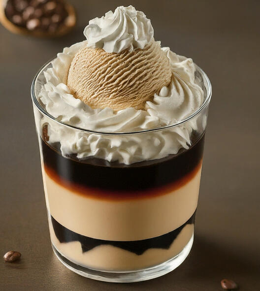 Fresh vanilla mousse placed at the bottom of a parfait glass followed by a layer of our coffee jelly, a scoop of homemade vanilla ice cream, a layer of brewed coffee, then cuts of coffee jelly and whipped cream, vanilla ice cream, whipped cream, coffee jelly, and finally then topped with more fresh fluffy whip cream, a scoop of coffee ice cream and more jelly.Almond Cream Croissant | (6,500 gil)