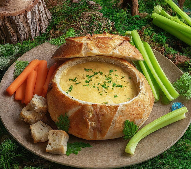 A hollowed out sourdough bread filled with a creamy, garlicy cheese dip served with carrots, celery, and croutons for dipping.Fairy Ring | (7,500 gil)